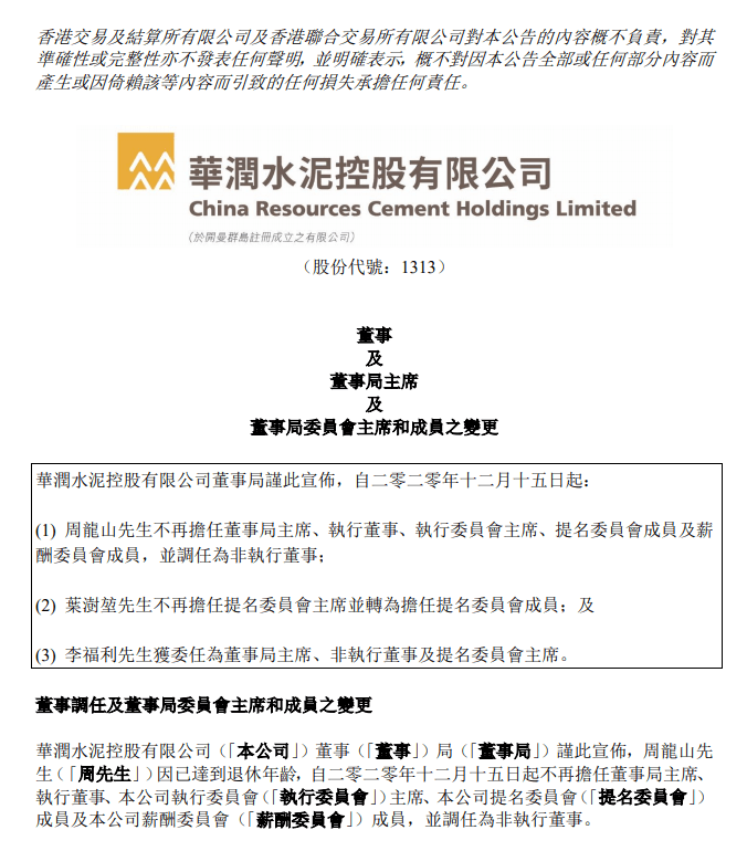 華潤(rùn)水泥控股(01313)公布,周龍山不再擔(dān)任董事局主席、執(zhí)行董事、執(zhí)行委員會(huì)主席、提名委員會(huì)成員及薪酬委員會(huì)成員,并調(diào)任為非執(zhí)行董事;