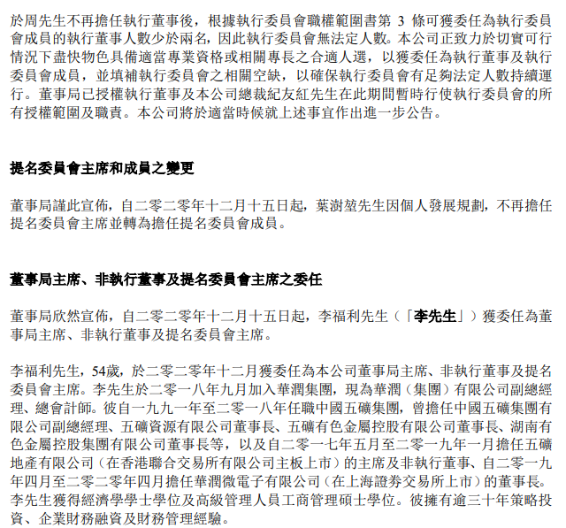 葉澍堃不再擔(dān)任提名委員會(huì)主席并轉(zhuǎn)為擔(dān)任提名委員會(huì)成員;同時(shí),李福利獲委任為董事局主席、非執(zhí)行董事及提名委員會(huì)主席。以上人事變動(dòng)均自2020年12月15日起。
