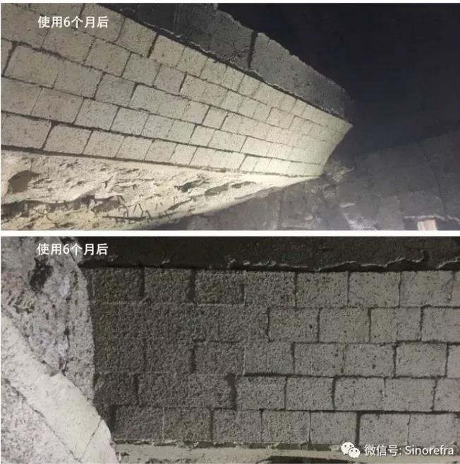 據(jù)了解,這一問題的“癥結(jié)”在于篦冷機(jī)喉部襯體的“特殊性”。篦冷機(jī)喉部通常選擇莫來石質(zhì)高耐磨澆注料作為襯體材料,該位置煙氣含塵量高,煙氣中熟料顆粒硬度大,風(fēng)速高,對襯體的沖刷磨損嚴(yán)重。部分結(jié)構(gòu)特殊的篦冷機(jī),還易產(chǎn)生較大的結(jié)構(gòu)應(yīng)力,引起襯體的開裂,熱煙氣沿裂縫進(jìn)入襯體內(nèi)部,造成襯體損壞,導(dǎo)致喉部超溫或殼體燒穿。在傳統(tǒng)的施工過程中,喉部頂部有混凝土水泥梁存在,空間狹小,施工比較困難,施工質(zhì)量很難得到保證,襯體內(nèi)部含水量加大,在點(diǎn)火升溫過程中喉部襯體很容易爆裂。因此,篦冷機(jī)喉部襯體使用壽命普遍偏低,甚至有的只有3-4個月的壽命,嚴(yán)重影響了水泥窯的正常安全運(yùn)行。現(xiàn)在,大多數(shù)企業(yè)為了減少現(xiàn)場施工工序復(fù)雜對質(zhì)量和進(jìn)度的影響,多已采用預(yù)制成形的耐火預(yù)制件產(chǎn)品作為襯體材料。預(yù)制件在篦冷機(jī)喉部的使用,大幅度提高了喉部襯體的強(qiáng)度和耐磨性能,避免了爆裂的風(fēng)險,延長的喉部襯體的使用壽命。據(jù)水泥人網(wǎng)了解,冀東合川、冀東璧山、葛洲壩當(dāng)陽、華沃水泥(棗莊)等公司都選用了通達(dá)耐火的篦冷機(jī)喉部預(yù)制件產(chǎn)品。據(jù)企業(yè)負(fù)責(zé)人介紹,其產(chǎn)品以優(yōu)質(zhì)莫來石和碳化硅為主要原料,成型后經(jīng)過1200℃高溫?zé)芍迫 ?shí)現(xiàn)了不定形產(chǎn)品的靈活性和定形產(chǎn)品的穩(wěn)定性的有機(jī)結(jié)合,具有質(zhì)量穩(wěn)定、形式簡單、施工方便和結(jié)構(gòu)穩(wěn)定的特點(diǎn)。其使用效果明顯優(yōu)于現(xiàn)場澆注的襯體。華沃水泥(棗莊)喉部預(yù)制件使用8個月后,預(yù)制件表面僅有輕微侵蝕,體現(xiàn)出喉部預(yù)制件優(yōu)異的抗堿侵蝕性能。
