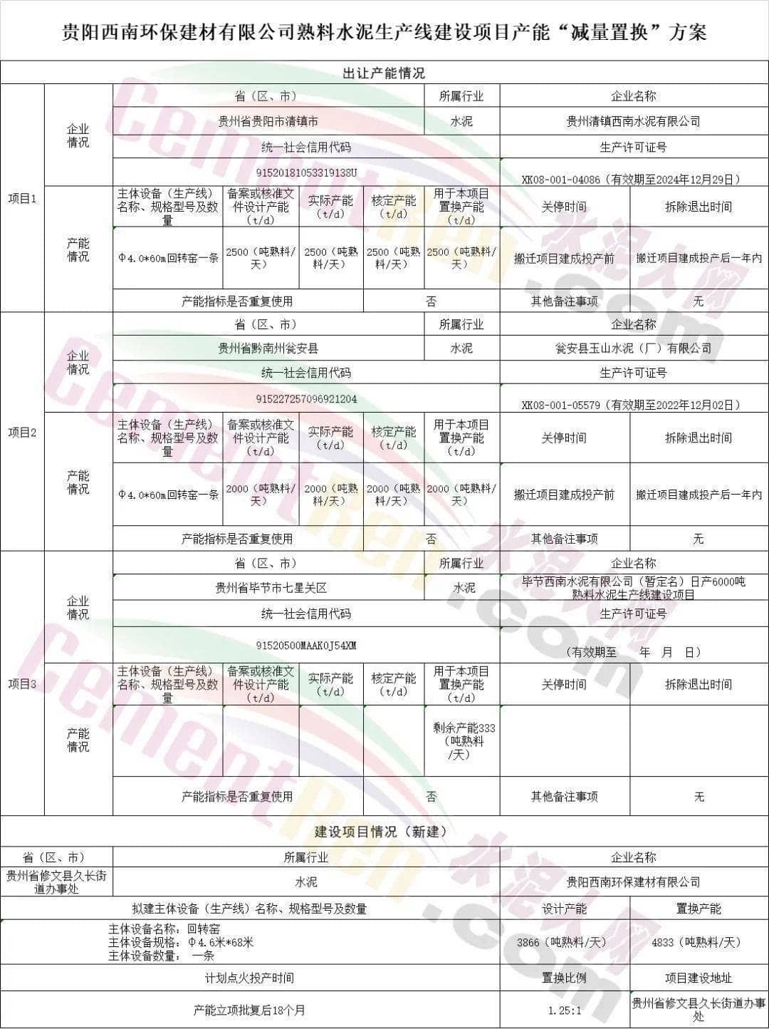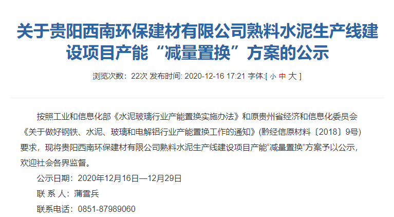 日前, 貴陽市工業(yè)和信息化廳發(fā)布了 貴陽西南環(huán)保建材有限公司日產(chǎn)3866噸熟料水泥生產(chǎn)線項(xiàng)目產(chǎn)能置換方案公示。公示文件顯示,新建生產(chǎn)線產(chǎn)能指標(biāo)分別來自貴州清鎮(zhèn)西南水泥有限公司、甕安縣玉山水泥(廠)有限公司和畢節(jié)西南水泥有限公司3家企業(yè),新建生產(chǎn)線將于產(chǎn)能立項(xiàng)批復(fù)后18個(gè)月。