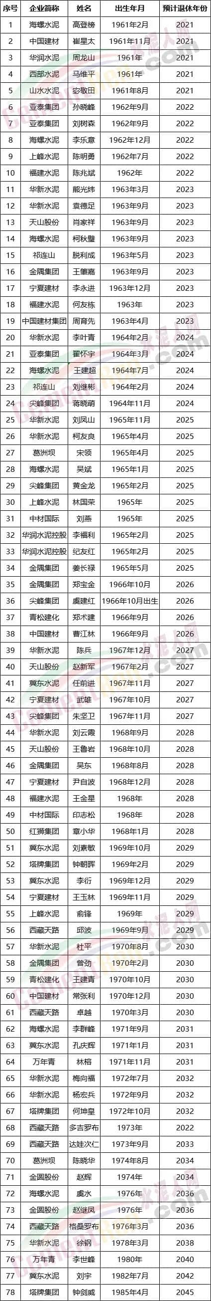 據(jù)水泥人網(wǎng)不完全統(tǒng)計78位上市企業(yè)高管中有34位將于5年內(nèi)到退休年齡。其中海螺水泥總工李樂意2022年到退休年齡,祁連山水泥董事長脫利成、華新水泥南部事業(yè)部總裁熊光煒、湖北西部事業(yè)部總裁袁德足、天山股份肖家祥、海螺水泥柯秋璧2023年到退休年齡, 華新水泥總裁李葉青、尖峰集團(tuán)董事長蔣曉萌、海螺水泥副董事長王建超、亞泰集團(tuán)翟懷宇、祁連山水泥總裁劉繼彬2024年到退休年齡... ...