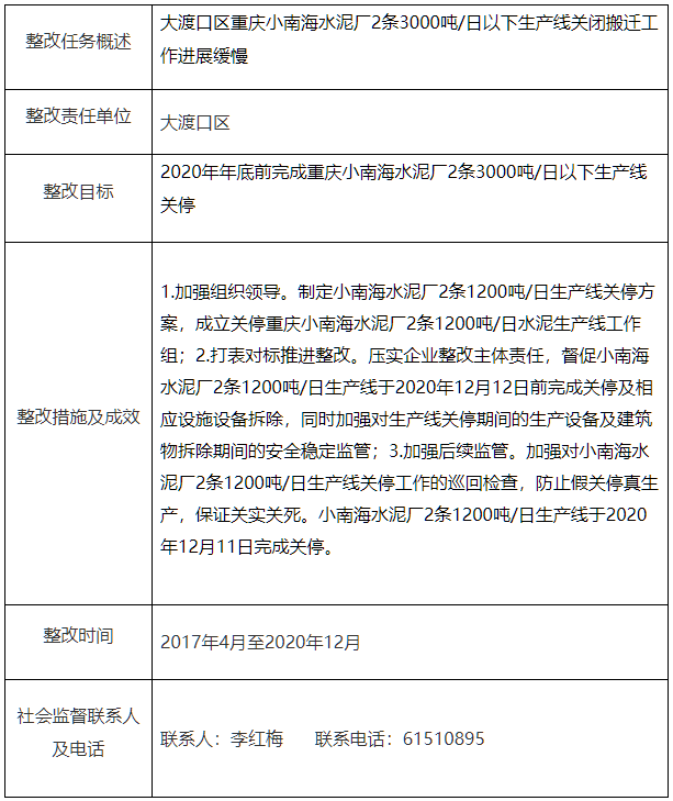 日前,重慶市大渡口區(qū)生態(tài)環(huán)境局,重慶小南海水泥廠2條1200噸日生產(chǎn)線整改銷號情況公示表。其中整改措施及成效一項顯示: 此次整改措施包括制定小南海水泥廠2條1200噸/日生產(chǎn)線關(guān)停方案,成立關(guān)停重慶小南海水泥廠2條1200噸/日水泥生產(chǎn)線工作組;打表對標(biāo)推進整改。壓實企業(yè)整改主體責(zé)任,督促小南海水泥廠2條1200噸/日生產(chǎn)線于2020年12月12日前完成關(guān)停及相應(yīng)設(shè)施設(shè)備拆除,同時加強對生產(chǎn)線關(guān)停期間的生產(chǎn)設(shè)備及建筑物拆除期間的安全穩(wěn)定監(jiān)管;加強后續(xù)監(jiān)管。加強對小南海水泥廠2條1200噸/日生產(chǎn)線關(guān)停工作的巡回檢查,防止假關(guān)停真生產(chǎn),保證關(guān)實關(guān)死。小南海水泥廠2條1200噸/日生產(chǎn)線于2020年12月11日完成關(guān)停。