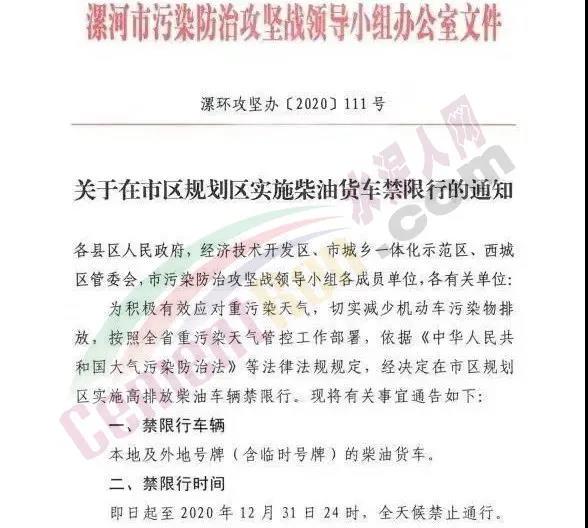 12月14日,河南省漯河市污染防治攻堅(jiān)戰(zhàn)領(lǐng)導(dǎo)小組辦公室發(fā)布通知,即日起至2020年12月31日24時(shí),在城市規(guī)劃區(qū)內(nèi)的所有道路(不含高速公路)禁止所有柴油貨車通行。確需在禁限行區(qū)內(nèi)通行的,需拿到相關(guān)通行證,并且車輛應(yīng)達(dá)到國(guó)五及以上排放標(biāo)準(zhǔn)要求,否則將依法予以處罰并予以公開(kāi)曝光。
