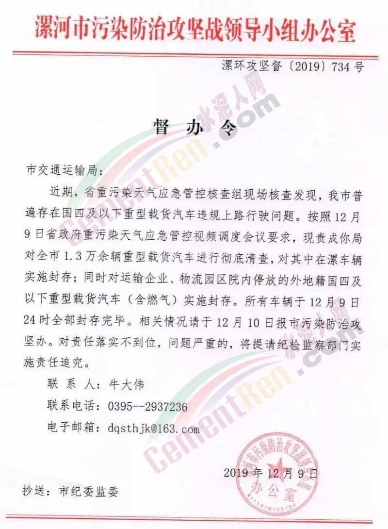 隨后官方宣稱,漯河市交通運(yùn)輸局收到省督辦令。要求對(duì)全市1.3萬(wàn)余輛重型載貨汽車進(jìn)行清查,對(duì)在漯車輛實(shí)施封存;同時(shí)對(duì)運(yùn)輸企業(yè),物流園區(qū)院內(nèi)停放的外地籍國(guó)四及以下重型載貨汽車(含燃?xì)?實(shí)施封存。