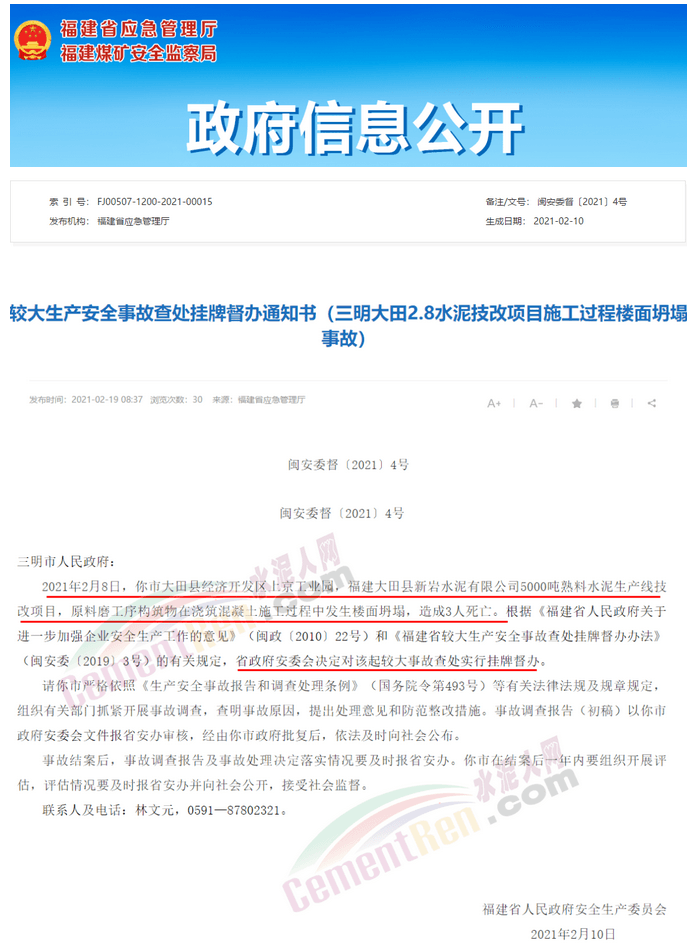 據(jù)水泥人網了解,福建省應急管理廳發(fā)布較大生產安全事故查處掛牌督辦通知書(三明大田2.8水泥技改項目施工過程樓面坍塌事故)稱,2021年2月8日,三明市大田縣經濟開發(fā)區(qū)上京工業(yè)園,福建大田縣新巖水泥有限公司5000噸熟料水泥生產線技改項目,原料磨工序構筑物在澆筑混凝土施工過程中發(fā)生樓面坍塌,造成3人死亡。 依據(jù)有關規(guī)定,福建省政府安委會決定對該起較大事故查處實行掛牌督辦。