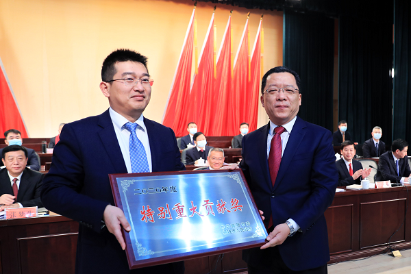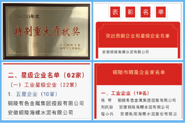 2月18日上午,銅陵市政府組織召開全市雙招雙引暨重大項目攻堅年動員大會。市委書記丁純同志出席會議并講話,市委副書記、市長胡啟生同志主持會議。大會首次對全市有突出貢獻(xiàn)的、發(fā)展快的、質(zhì)態(tài)好的企業(yè)進(jìn)行了星級評定和表彰。銅陵海螺榮獲“特別重大貢獻(xiàn)獎”“畝均效益貢獻(xiàn)獎”“五星級企業(yè)”稱號,公司總經(jīng)理劉慶新同志榮獲“明星企業(yè)家”稱號,并代表公司接受市委書記丁純同志的現(xiàn)場授牌。