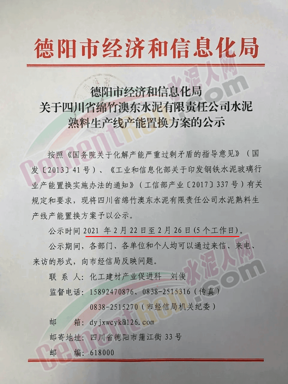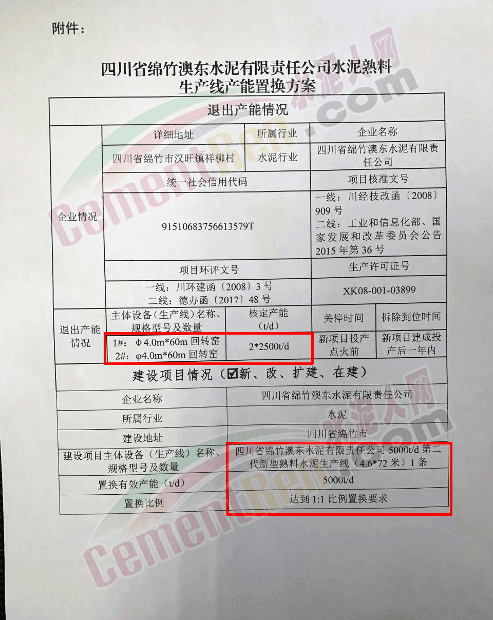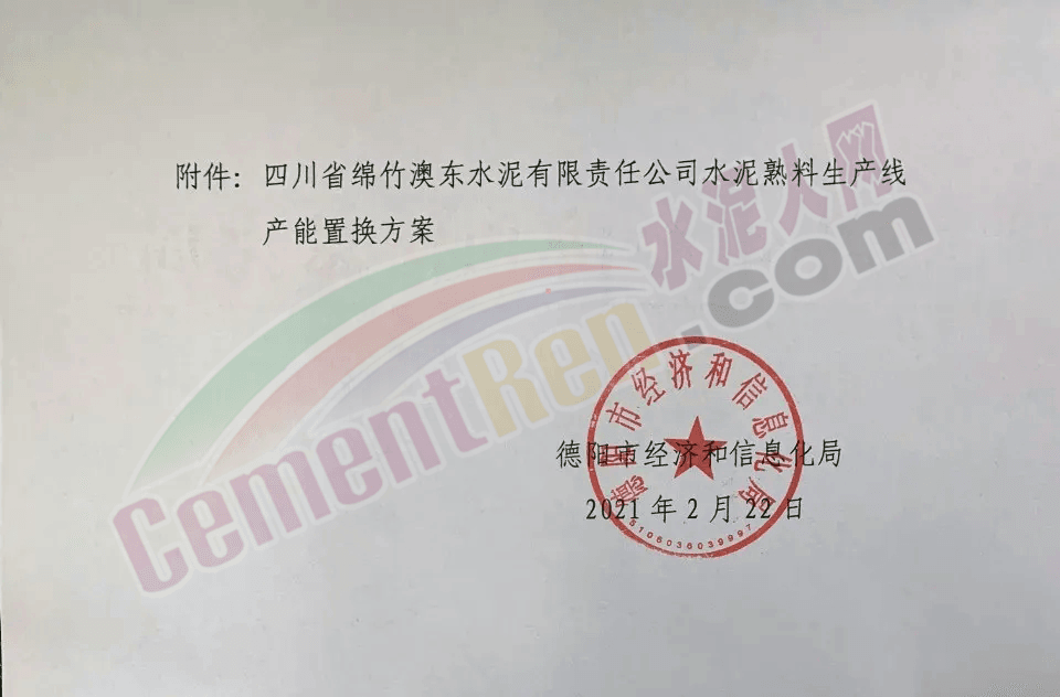 日前,四川省德陽經(jīng)濟(jì)和信息化局發(fā)布《關(guān)于四川省綿竹澳東水泥有限責(zé)任公司水泥熟料生產(chǎn)線產(chǎn)能置換方案的公示》。公示內(nèi)容為四川省綿竹澳東水泥有限責(zé)任公司退出兩條2500t/d熟料生產(chǎn)線于用在區(qū)域內(nèi)新建一條5000t/d熟料生產(chǎn)線,置換比例為1:1。