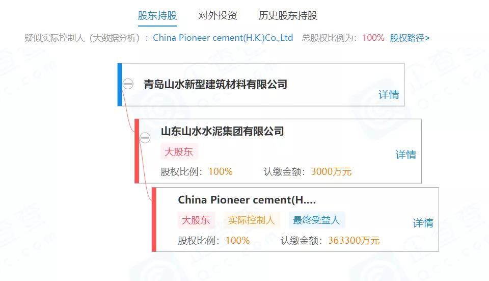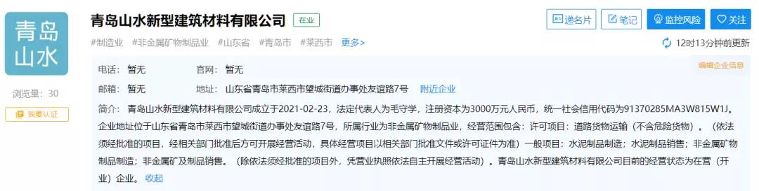 據(jù)查閱,山水新建成立于2021年2月23日,法定代表人為毛守學(xué),注冊資本為3000萬元人民幣。其經(jīng)營范圍包括水泥制品制造、水泥制品銷售等。該公司目前由山水水泥持股100%。