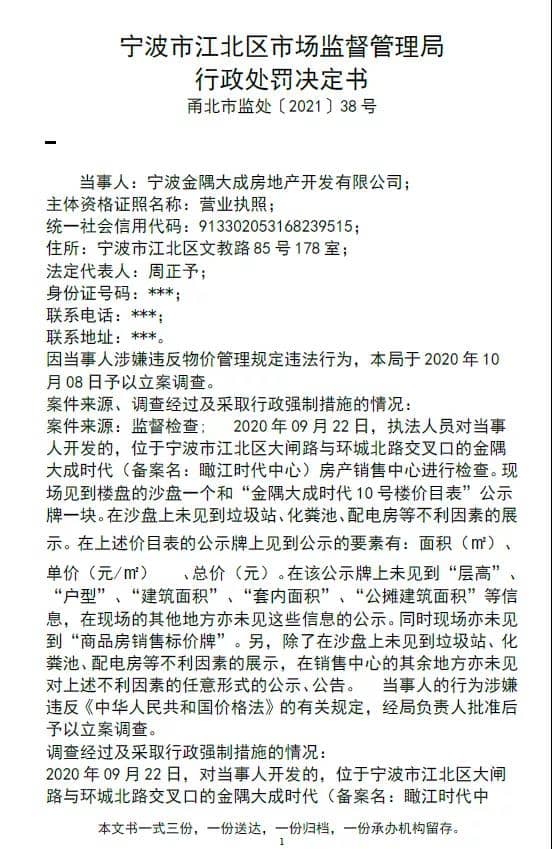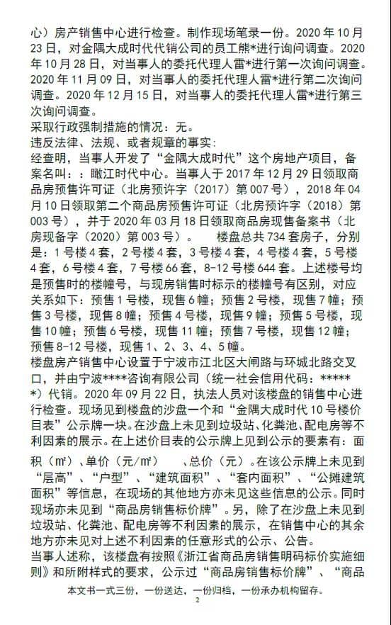 行政處罰決定書顯示這起案件來源為監(jiān)督檢查:“2020年9月22日,執(zhí)法人員對當(dāng)事人金隅大成地產(chǎn)開發(fā)的,位于寧波市江北區(qū)大閘路與環(huán)城北路交叉口的金隅大成時代(瞰江時代中心)房產(chǎn)銷售中心進行檢查?,F(xiàn)場見到樓盤的沙盤一個和“金隅大成時代10號樓價目表”公示牌一塊。在沙盤上未見到垃圾站、化糞池、配電房等不利因素的展示。在上述價目表的公示牌上見到公示的要素有:面積(平方米)、單價(元/平方米)、總價(元)。在該公示牌上未見到“層高”、“戶型”、“建筑面積”、“套內(nèi)面積”、“公攤建筑面積”等信息,在現(xiàn)場的其他地方亦未見這些信息的公示。同時現(xiàn)場亦未見到“商品房銷售標價牌”。另,除了在沙盤上未見到垃圾站、化糞池、配電房等不利因素的展示,在銷售中心的其余地方亦未見對上述不利因素的任意形式的公示、公告。當(dāng)事人的行為涉嫌違反《中華人民共和國價格法》的有關(guān)規(guī)定,經(jīng)局負責(zé)人批準后予以立案調(diào)查。”