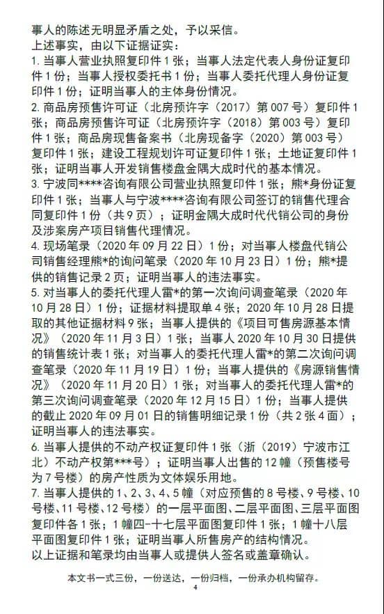 案件調(diào)查經(jīng)過如下:“2020年9月22日,對當(dāng)事人金隅大成地產(chǎn)開發(fā)的,位于寧波市江北區(qū)大閘路與環(huán)城北路交叉口的金隅大成時代(備案名:瞰江時代中心)房產(chǎn)銷售中心進行檢查。制作現(xiàn)場筆錄一份。2020年10月23日,對金隅大成時代代銷公司的員工熊某進行詢問調(diào)查。2020年10月28日,對當(dāng)事人的委托代理人雷某進行第一次詢問調(diào)查。2020年11月9日,對當(dāng)事人的委托代理人雷某進行第二次詢問調(diào)查。2020年12月15日,對當(dāng)事人的委托代理人雷某進行第三次詢問調(diào)查。”