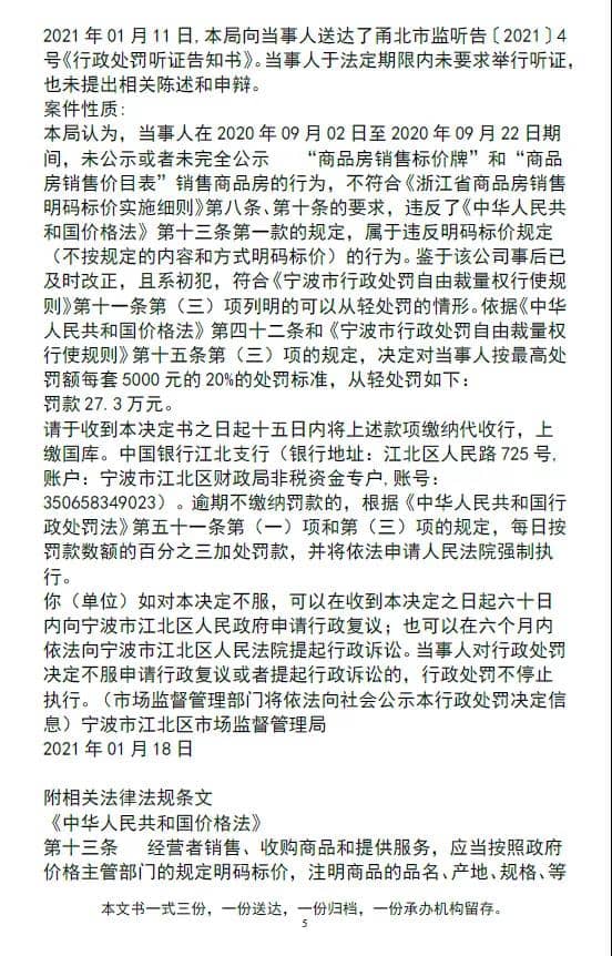 近日,浙江寧波市江北區(qū)市場監(jiān)督管理局對寧波金隅大成房地產(chǎn)開發(fā)有限公司(以下簡稱:“金隅大成地產(chǎn)”)罰款27.3萬元,處罰事由為其開發(fā)的金隅大成時代項目(備案名:瞰江時代中心)存在未公示或者未完全公示“商品房銷售 標價牌”和“商品房銷售價目表”銷售商品房的行為,該違法行為違反明碼標價規(guī)定(不按規(guī)定的內(nèi)容和方式明碼標價)。行政處罰決定書文號:甬北市監(jiān)處[2021]38號。