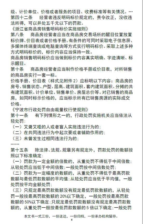 鑒于金隅大成地產(chǎn)事后已及時改正,且系初犯,符合《寧波市行政處罰自由裁量權(quán)行使規(guī)則》第十一條第(三)項列明的可以從輕處罰的情形。寧波市江北區(qū)市場監(jiān)督管理局依據(jù)《中華人民共和國價格法》第四十二條和《寧波市行政處罰自由裁量權(quán)行使規(guī)則》第十五條第(三)項的規(guī)定,決定對當(dāng)事人按最高處罰額每套5000元的20%的處罰標準,從輕處罰如下:罰款27.3萬元。