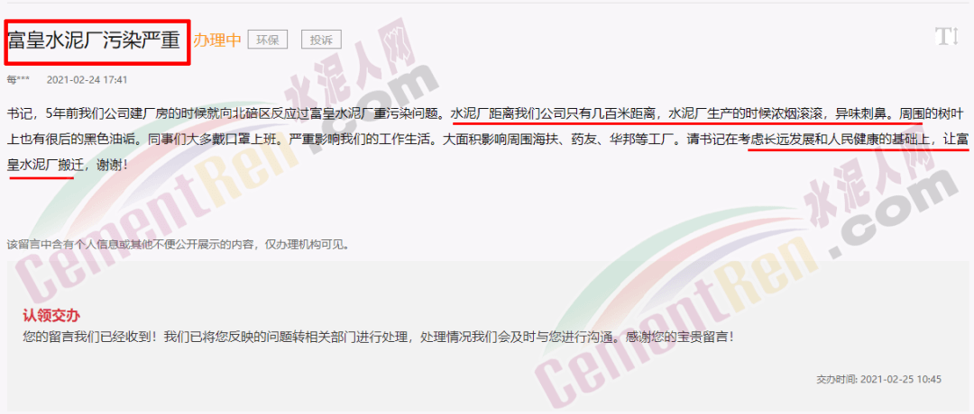 日前,有網(wǎng)友在人民網(wǎng)留言板上留言稱:5年前公司建廠房的時(shí)候就向北碚區(qū)反應(yīng)過富皇水泥廠重污染問題。水泥廠距離公司只有幾百米距離,水泥廠生產(chǎn)的時(shí)候濃煙滾滾,異味刺鼻。周圍的樹葉上也有很厚的黑色油垢。同事們大多戴口罩上班。嚴(yán)重影響我們的工作生活。大面積影響周圍海扶、藥友、華邦等工廠。請書記在考慮長遠(yuǎn)發(fā)展和人民健康的基礎(chǔ)上,讓富皇水泥廠搬遷。