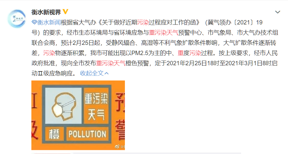 根據(jù)省大氣辦《關(guān)于做好近期污染過程應(yīng)對工作的函》(冀氣領(lǐng)辦〔2021〕19號)的要求,經(jīng)衡水市生態(tài)環(huán)境局與省環(huán)境應(yīng)急與重污染天氣預警中心、衡水市氣象局、衡水市大氣辦技術(shù)組聯(lián)合會商,預計2月25日起,受靜風輻合、高濕等不利氣象擴散條件影響,大氣擴散條件逐漸轉(zhuǎn)差,污染物逐漸積累,衡水市可能出現(xiàn)以PM2.5為主的中、重度污染過程。按上級要求,經(jīng)衡水市人民政府批準,現(xiàn)向全市發(fā)布重污染天氣橙色預警,定于2021年2月25日18時至2021年3月1日8時啟動Ⅱ級應(yīng)急響應(yīng)。