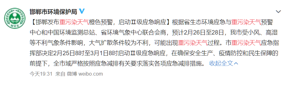 根據(jù)省大氣辦《關(guān)于做好近期污染過程應(yīng)對工作的函》(冀氣領(lǐng)辦函〔2021〕19號),預計2月26-28日,受地面高壓及偏南風影響、大氣擴散條件逐漸轉(zhuǎn)差,我市可能出現(xiàn)中度至重度污染天氣過程。經(jīng)市政府批準,于2月25日12:00啟動重污染天氣Ⅱ級應(yīng)急響應(yīng)措施。本次預警解除時間3月1日8:00。