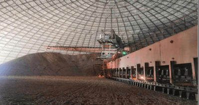 新金峰公司有2條日產(chǎn)4500噸水泥生產(chǎn)線,分別為A線和B線,每條生產(chǎn)線設有獨立的均化庫(運用堆取料技術實現(xiàn)原料的初步均化,兼具貯存與均化功能),每座均化庫有一臺圓形堆取料機(以下簡稱堆取料機),為石灰石堆料和取料一體機。上部為回轉(zhuǎn)懸臂式堆料機(以下簡稱堆料機),用于石灰石分層堆料(使不同碳酸鈣含量的石灰石分布均勻),下部為橋式刮板取料機(以下簡稱取料機),用于均化后石灰石取料。(如圖一)