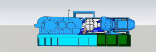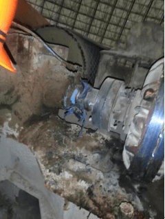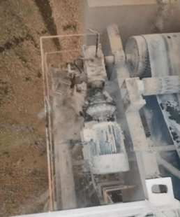 A線均化庫為半球形鋼結構,直徑120米,高37米,均化庫大門朝北,距均化庫大門18.6米處為堆取料機,事發(fā)地點位于堆取料機減速機平臺內(nèi)(長2.4米,寬0.8米,整體高度為1.6米),由西至東分別為減速器(長0.7米,寬0.55米)、電磁離合器(長0.8米,直徑為0.45米,距平臺底部間隙為0.1米)和取料減速電機(長0.9米,寬0.8米)(如圖四)?,F(xiàn)場勘查發(fā)現(xiàn)與電磁離合器傳動部位脫離的拱形防護罩(寬0.3米,高0.35米)在減速機平臺底部西北側。平臺上電磁離合器傳動部位可見明顯血跡,電磁離合器傳動軸連接處可見衣物碎片(如圖五)。