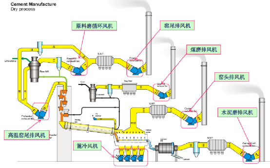 在水泥生產(chǎn)線中,風(fēng)機(jī)是水泥廠的第二大功率消耗設(shè)備群, 一條中等規(guī)模的水泥生產(chǎn)線,僅大型風(fēng)機(jī)就有7-10臺,小型風(fēng)機(jī)百余臺。