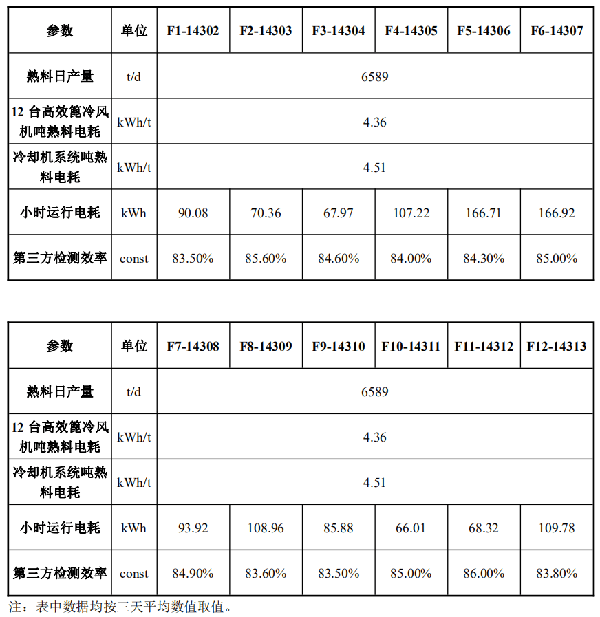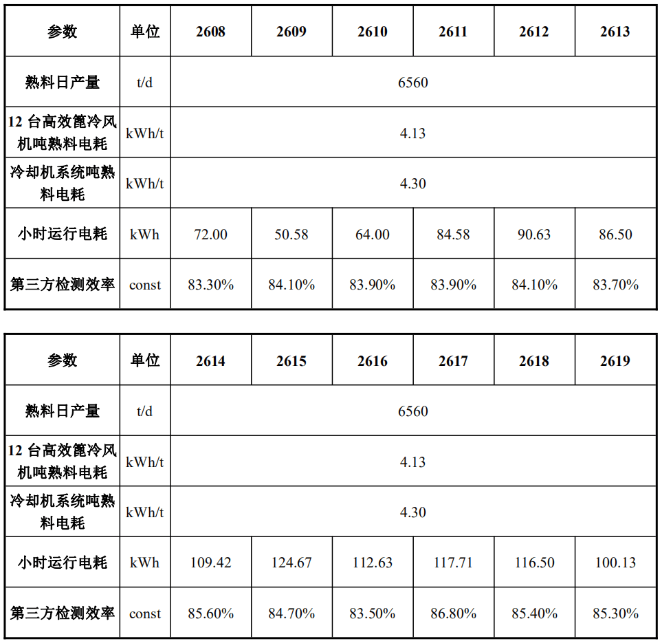 經(jīng)瑞晨環(huán)保改造后,四川國大12臺高效篦冷風(fēng)機(jī)F1-14302~F12-14313運(yùn)行穩(wěn)定,經(jīng)過第三方(綿陽旗諾)標(biāo)定,運(yùn)行效率分別高達(dá)83.50%、85.60%、84.60%、84.00%、84.30%、85.00%、84.90%、83.60%、83.50%、85.00%、86.00%、83.80%。熟料提產(chǎn)至6589t/d后,12臺高效篦冷風(fēng)機(jī)噸熟料電耗降低至4.36kWh/t,篦冷機(jī)系統(tǒng)熟料電耗降低至4.51kWh/t滿足技術(shù)合同約定的噸熟料電耗≤4.93kWh/t。