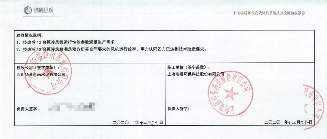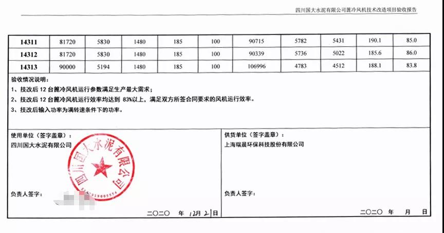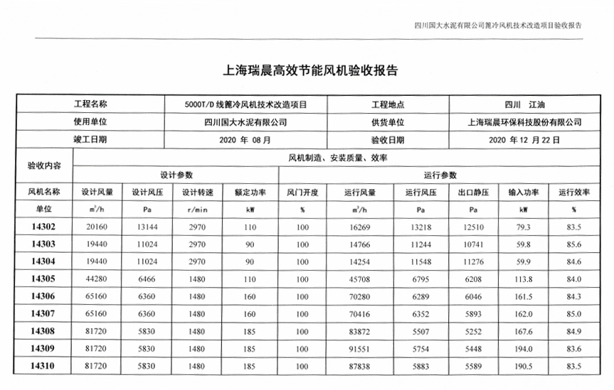 經(jīng)瑞晨環(huán)保改造后,華鎣西南12臺高效篦冷風(fēng)機(jī)2608-2619運(yùn)行穩(wěn)定,經(jīng)第三方(綿陽旗諾)檢測,運(yùn)行效率分別高達(dá)83.30%、84.10%、83.90%、83.90%、84.10%、83.70%、85.60%、84.70%、83.50%、86.80%、85.40%、85.30%,并在熟料提產(chǎn)至6560t/d后12臺高效篦冷風(fēng)機(jī)噸熟料電耗降低至4.13kWh/t,篦冷機(jī)系統(tǒng)噸熟料電耗降低至4.30kWh/t,滿足技術(shù)合同約定的篦冷機(jī)系統(tǒng)噸熟料電耗≤4.73kWh/t。瑞晨環(huán)保高效篦冷風(fēng)機(jī)配合成都院配套IKN第四代篦冷床的升級換代項(xiàng)目完美驗(yàn)收,瑞晨環(huán)保高效篦冷風(fēng)機(jī)得到成都院與四川華鎣西南水泥有限公司各層領(lǐng)導(dǎo)以及西南水泥高層的高度認(rèn)可與一致好評。
