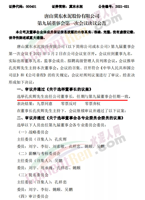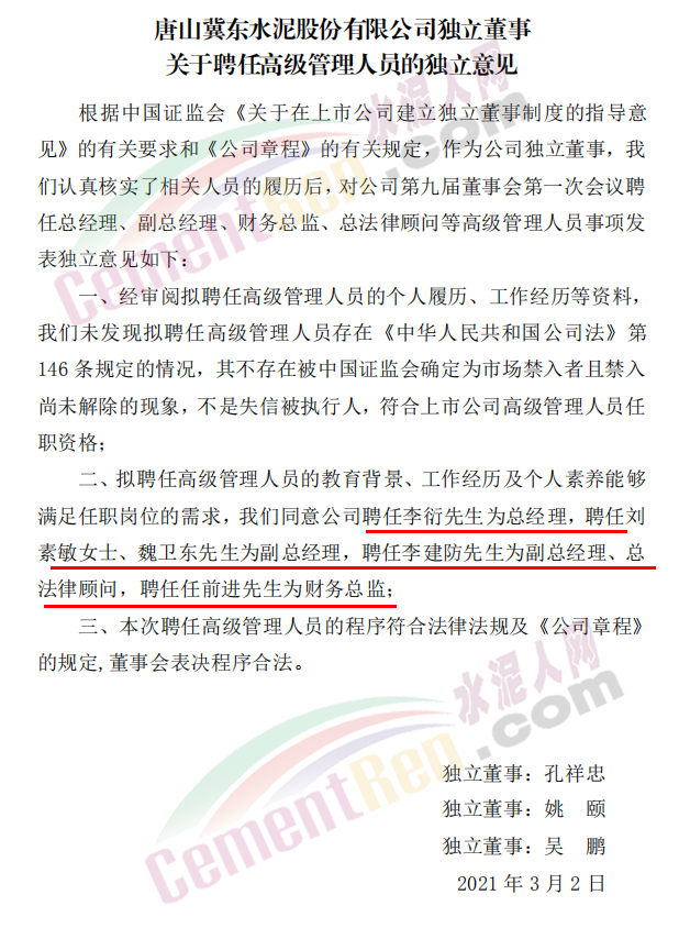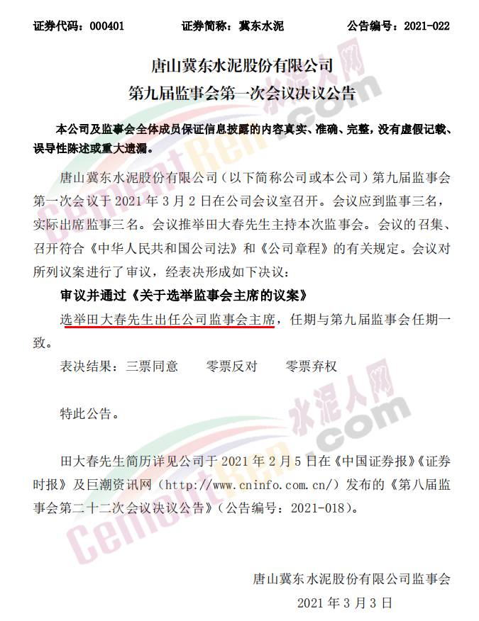 3月2日晚間唐山冀東水泥上市公司連發(fā)五條公告,內(nèi)容為董事長、總經(jīng)理、監(jiān)事會主席,以及其他高級管理人員的選舉及任命。