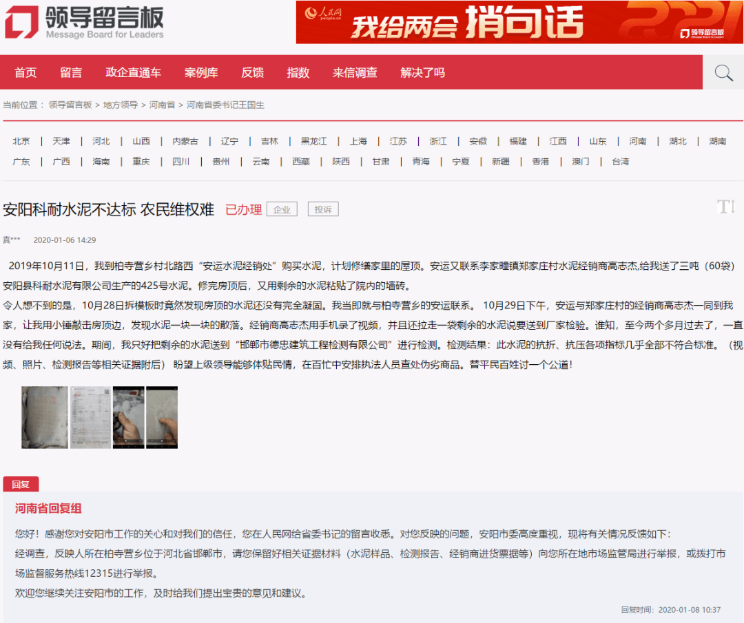 河南省回復(fù):“您好!感謝您對(duì)安陽市工作的關(guān)心和對(duì)我們的信任,您在人民網(wǎng)給省委書記的留言收悉。對(duì)您反映的問題,安陽市委高度重視,現(xiàn)將有關(guān)情況反饋如下:經(jīng)調(diào)查,反映人所在柏寺營鄉(xiāng)位于河北省邯鄲市,請(qǐng)您保留好相關(guān)證據(jù)材料(水泥樣品、檢測(cè)報(bào)告、經(jīng)銷商進(jìn)貨票據(jù)等)向您所在地市場(chǎng)監(jiān)管局進(jìn)行舉報(bào),或撥打市場(chǎng)監(jiān)督服務(wù)熱線12315進(jìn)行舉報(bào)。歡迎您繼續(xù)關(guān)注安陽市的工作,及時(shí)給我們提出寶貴的意見和建議。”