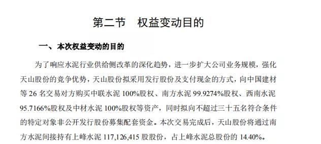 同日,浙江尖峰集團(tuán)股份有限公司(以下簡稱“尖峰集團(tuán)”)發(fā)布公告稱,擬參與新疆天山水泥股份有限公司(以下簡稱“天山股份”)的重大資產(chǎn)重組。尖峰集團(tuán)現(xiàn)持有南方水泥有限公司(以下簡稱“南方水泥”)0.95336%股權(quán)(對(duì)應(yīng)注冊(cè)資本中的出資額為10,500萬元),該股權(quán)經(jīng)評(píng)估定價(jià)為46,528.909270萬元,天山股份擬以發(fā)行股份購買資產(chǎn)的方式收購該股權(quán)。若交易能順利實(shí)施且天山股份的發(fā)行價(jià)格不做調(diào)整,則交易完成后尖峰集團(tuán)將持有天山股份發(fā)行的股份34,774,969股,并不再持有南方水泥的股權(quán)。
