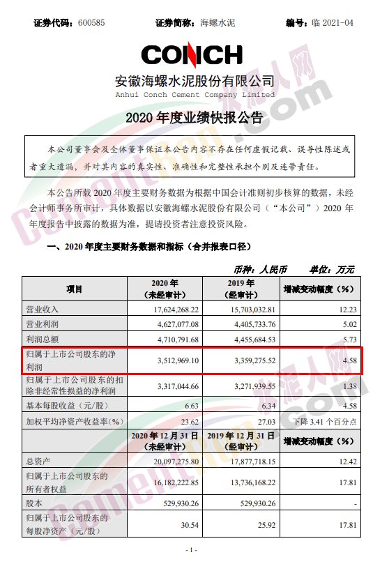 3月5日晚間發(fā)布2020年度業(yè)績快報,營業(yè)收入約1762.43億元,同比增加12.23%;歸屬于上市公司股東的凈利潤約351.30億元,同比增加4.58%;基本每股收益6.63元,同比增加4.58%。