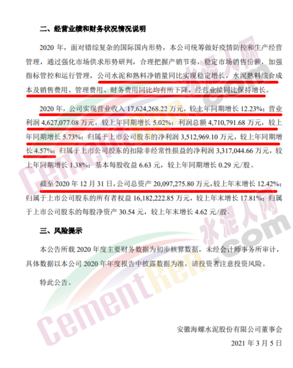 2020 年,面對錯綜復(fù)雜的國際國內(nèi)形勢,海螺水泥公司統(tǒng)籌做好疫情防控和生產(chǎn)經(jīng)營 管理,通過強化市場供求形勢研判,合理把握產(chǎn)銷節(jié)奏,穩(wěn)定市場銷售份額,加強指標(biāo)管控和運行管理,公司水泥和熟料凈銷量同比實現(xiàn)穩(wěn)定增長,水泥熟料綜合成 本及銷售費用、管理費用、財務(wù)費用同比均有所下降,經(jīng)營業(yè)績同比保持增長。