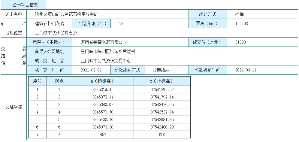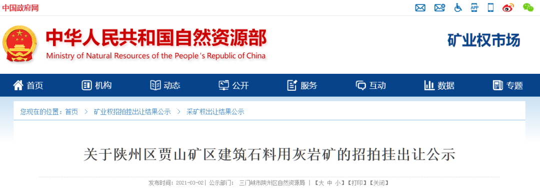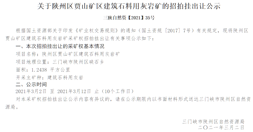 日前,河南三門峽市陜州區(qū)賈山礦區(qū)建筑石料用灰?guī)r礦采礦權(quán)掛牌出讓結(jié)果在網(wǎng)上公示,中標(biāo)人為河南省錦榮水泥有限公司。