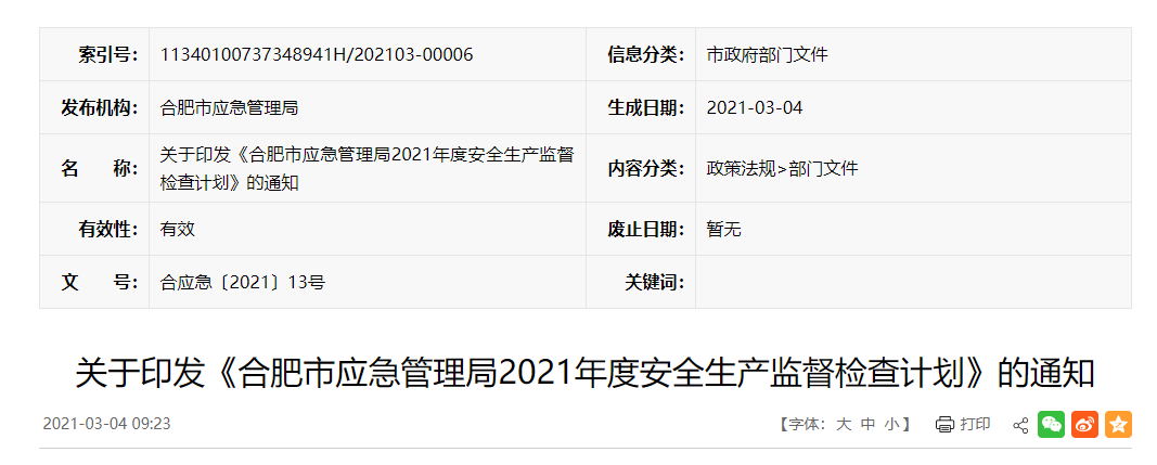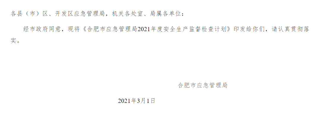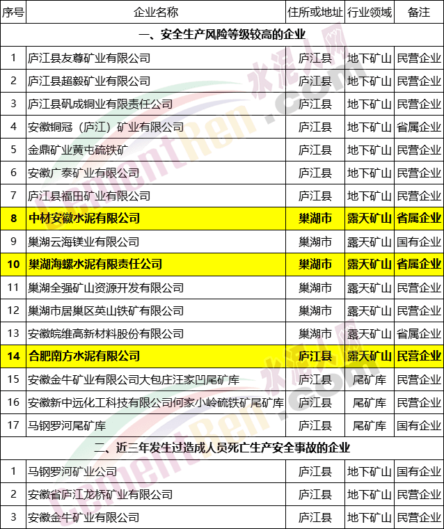 3月4日,安徽省合肥市人民政府網(wǎng)站發(fā)布《合肥市應(yīng)急管理局2021年度安全生產(chǎn)監(jiān)督檢查計(jì)劃》,將重點(diǎn)檢查20家安全生產(chǎn)風(fēng)險(xiǎn)等級(jí)較高的非煤礦山企業(yè)(10家地下礦山、7家露天礦山和3家尾礦庫(kù))。其中包括中材安徽水泥有限公司、巢湖海螺水泥有限責(zé)任公司、合肥南方水泥有限公司等企業(yè)的露天礦山。