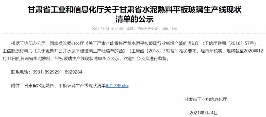 日前,甘肅省工業(yè)和信息化廳發(fā)布《甘肅省工業(yè)和信息化廳關(guān)于甘肅水泥熟料平板玻璃生產(chǎn)線現(xiàn)狀清單的公示》。