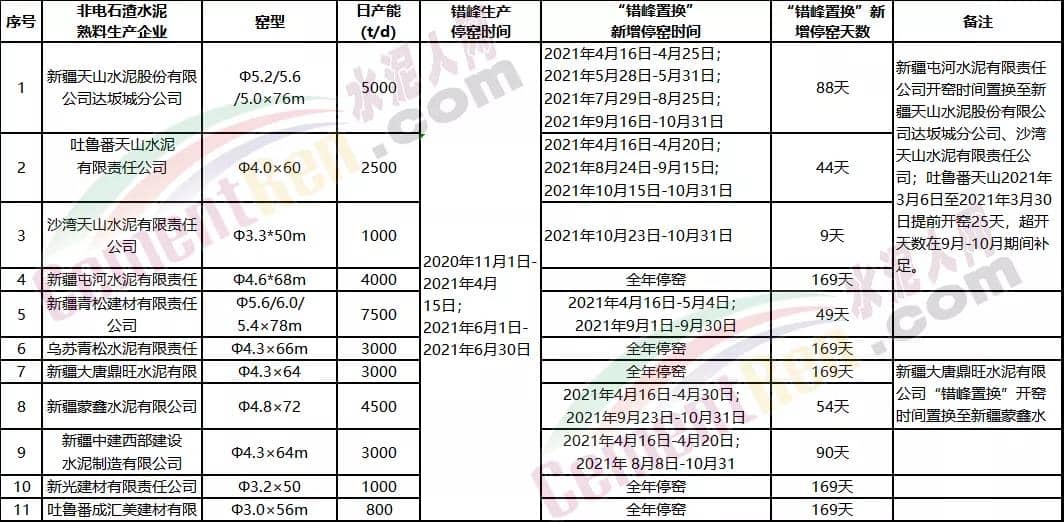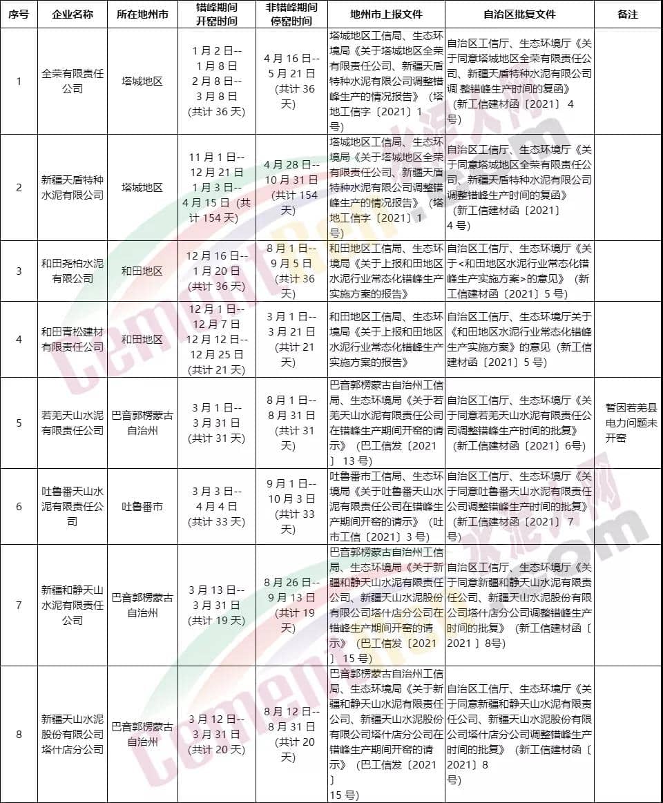 公告稱,為貫徹落實相關文 件要求,新疆建材行業(yè)協(xié)會組織電石渣生產水泥熟料企業(yè)與非電石渣水泥熟料生產企業(yè)溝通協(xié)調,上報了《烏昌石吐區(qū)域電石渣生產水泥熟料企業(yè)錯峰置換實施方案》(新建材協(xié)〔2021〕8號),另有部分地州工信局、生態(tài)環(huán)境局因區(qū)域市場供需關系提請變更有關企業(yè)錯峰時間。