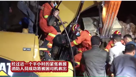 消防人員調(diào)集一輛挖掘機(jī)頂住落石防止二次事故,調(diào)另一輛挖掘機(jī)推石增加救援空間。經(jīng)過(guò)近一個(gè)半小時(shí)的緊張救援消防人員成功將被困司機(jī)救出。