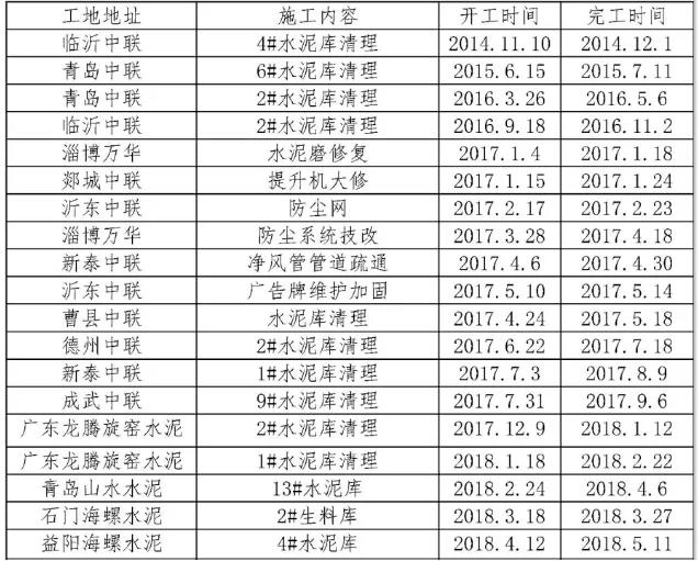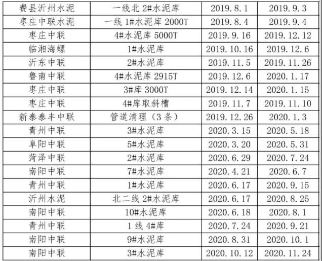 從首次清庫至今,鑫盛利共清理幾百個儲存庫,針對不同區(qū)域、氣候、庫型、施工現(xiàn)場工況作出相應的方案,并且做到一庫一檔方便后期維護及再次清理時查閱。現(xiàn)已進入成熟的清庫階段,并穩(wěn)步發(fā)展,與中聯(lián)、海螺、山水、沂州等水泥企業(yè)達成了戰(zhàn)略合作,為水泥企業(yè)的安全高效清庫提供了保障。