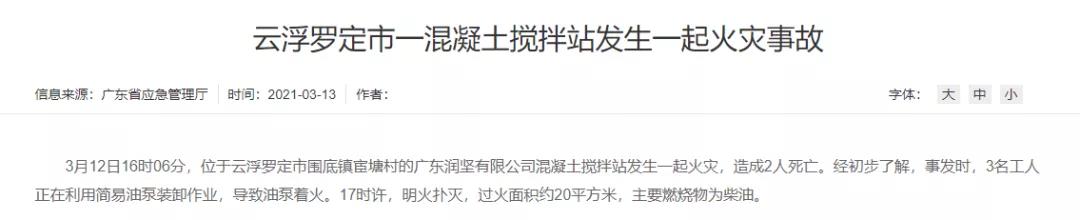 廣東省應(yīng)急管理廳消息,3月12日16時(shí)06分,位于廣東省云浮羅定市圍底鎮(zhèn)宦塘村的廣東潤(rùn)堅(jiān)有限公司混凝土攪拌站發(fā)生一起火災(zāi),造成2人死亡。經(jīng)初步了解,事發(fā)時(shí),3名工人正在利用簡(jiǎn)易油泵裝卸作業(yè),導(dǎo)致油泵著火。17時(shí)許,明火撲滅,過(guò)火面積約20平方米,主要燃燒物為柴油。