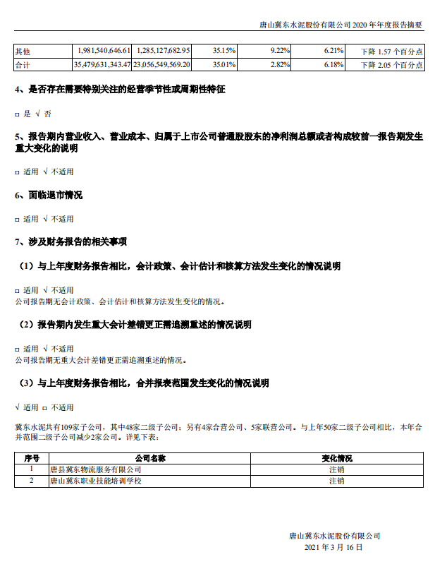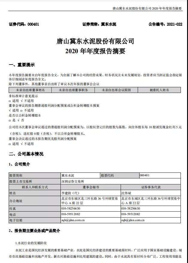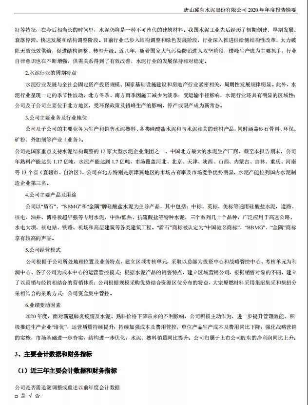 2020 年度,面對新冠肺炎疫情及水泥、熟料價格下降帶來的不利影響,公司積極主動作為,進一步提升管理效能,積極推進生產(chǎn)企業(yè)“培優(yōu)”,運營質(zhì)量持續(xù)提升;持續(xù)加強成本及費用管控,單位產(chǎn)品生產(chǎn)成本及費用同比下降;強化戰(zhàn)略營銷的實施,市場基礎(chǔ)進一步夯實,結(jié)構(gòu)進一步優(yōu)化,水泥、熟料銷量同比提升。公司歸屬于上市公司股東的凈利潤同比上升。