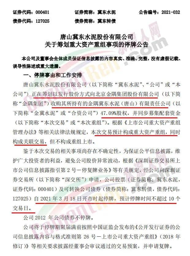 冀東水泥(000401)3月17日晚間公告,公司正在籌劃以發(fā)行股份方式向北京金隅集團股份有限公司收購其所持有的金隅冀東水泥(唐山)有限責(zé)任公司47.09%股權(quán),并同步募集配套資金。