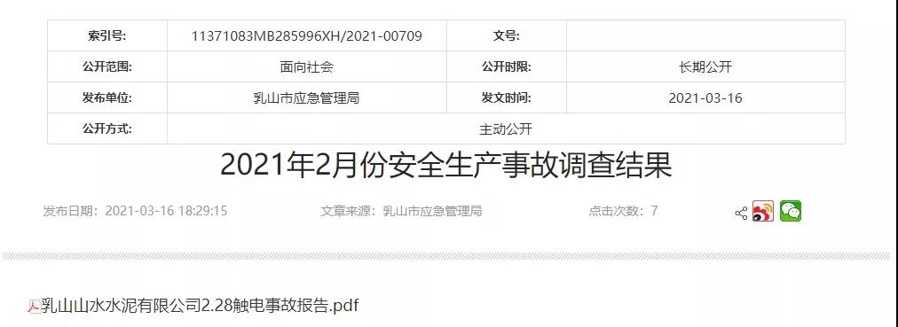 2021年2月28日10時20分,乳山山水水泥有限公司變壓器室在進行設備清理維護時,一人遭受電擊,經(jīng)搶救無效死亡,直接經(jīng)濟損失120萬元。