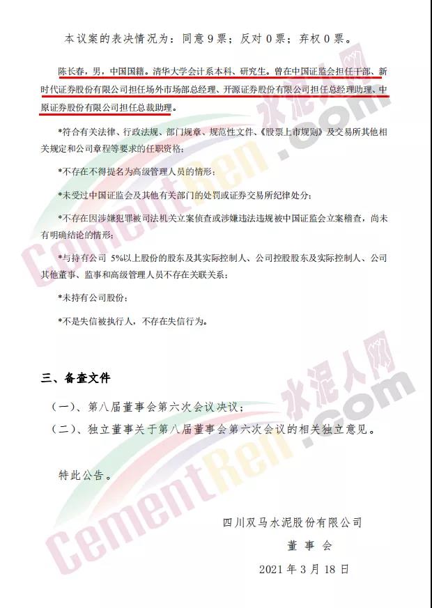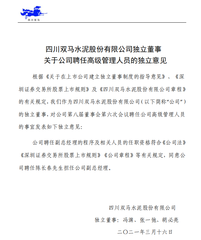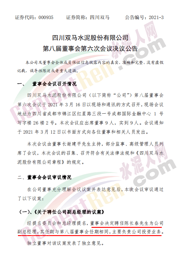 日前,四川雙馬(000935)發(fā)布公告稱,經(jīng)第八屆董事會(huì)第六次會(huì)議審議通過,決定聘任陳長(zhǎng)春為公司副總經(jīng)理,主要負(fù)責(zé)公司投資業(yè)務(wù)。