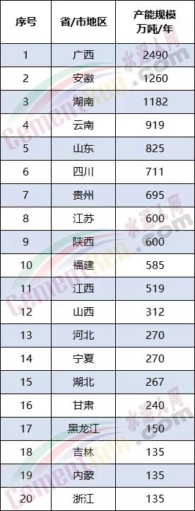 從上述新建項目分區(qū)域來看,廣西壯族自治區(qū)、安徽省、湖南省三個區(qū)域產能達到千萬噸以上,其中廣西地區(qū)新增產能規(guī)模達到2490萬噸/年,包括 11個項目13條新建生產線。