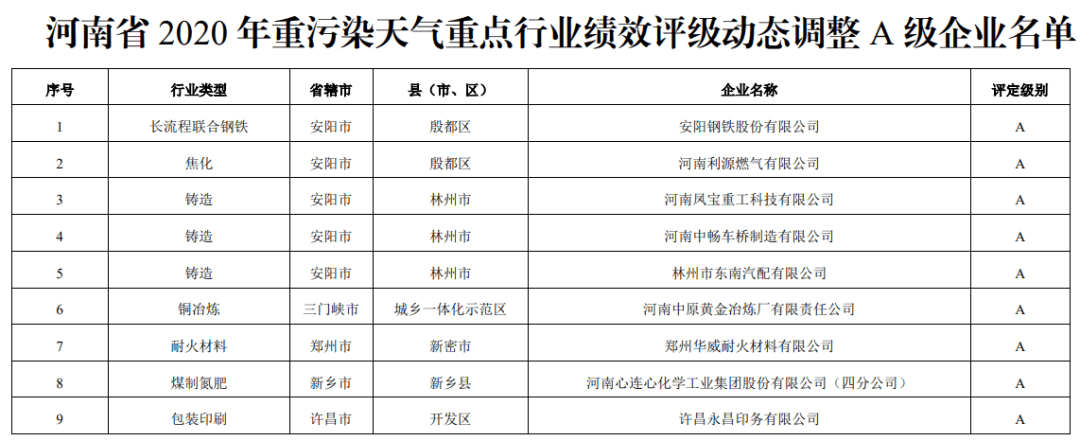 日前,河南省生態(tài)環(huán)境廳發(fā)布重污染天氣重點(diǎn)行業(yè)績(jī)效評(píng)級(jí)動(dòng)態(tài)調(diào)整結(jié)果的公告稱(chēng),2020年12月至2021年1月,河南省生礦環(huán)境廳組織相關(guān)處(室)單位和科研院所專(zhuān)家,在全省范圍內(nèi)開(kāi)展了2020年重點(diǎn)行業(yè)企業(yè)績(jī)效評(píng)級(jí)動(dòng)態(tài)調(diào)整工作,經(jīng)企業(yè)自評(píng)、資料審核、現(xiàn)場(chǎng)核驗(yàn)、專(zhuān)家會(huì)審,逐級(jí)審核認(rèn)定全省A、B級(jí)企業(yè)及績(jī)效引領(lǐng)性企業(yè)共計(jì)198家,其中,A級(jí)企業(yè)9家,B級(jí)企業(yè)114家,績(jī)效引領(lǐng)性企業(yè)75家。