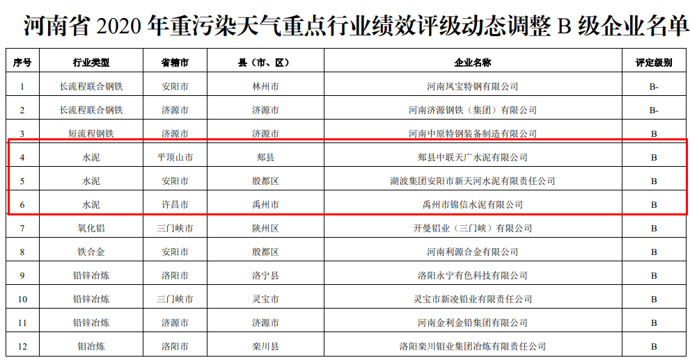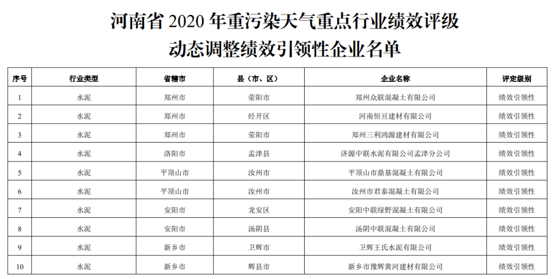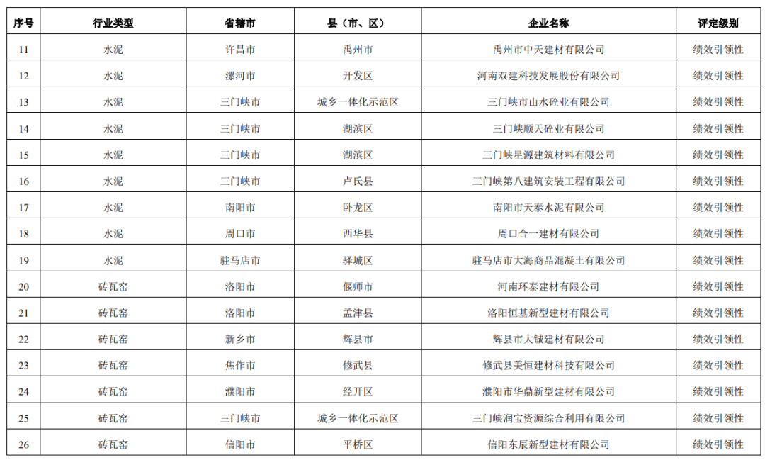 其中水泥行業(yè)郟縣中聯(lián)天廣水泥有限公司、湖波集團(tuán)安陽(yáng)市新天河水泥有限責(zé)任公司、禹州市錦信水泥有限公司三家企業(yè)獲評(píng)B級(jí);安陽(yáng)中聯(lián)綠野混凝土有限公司、湯陰中聯(lián)混凝土有限公司、衛(wèi)輝王氏水泥有限公司等19家企業(yè)獲評(píng)績(jī)效引性型企業(yè)。