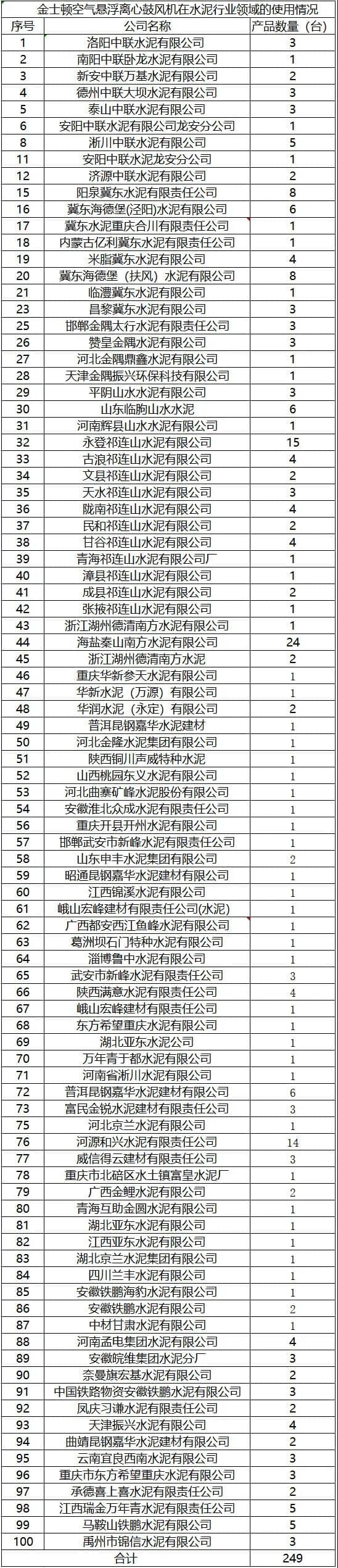 自金隅太行成功的使用了兩臺空氣懸浮風(fēng)機(jī)后,更多的水泥企業(yè)開始嘗試使用金士頓空氣懸浮風(fēng)機(jī)。據(jù)水泥人網(wǎng)不完全統(tǒng)計,截止目前水泥行業(yè)領(lǐng)域共有249臺金士頓空氣懸浮風(fēng)機(jī)投入使用,金隅冀東,祁連山水泥,山水水泥,南方水泥,中聯(lián)水泥,東方希望水泥,華新水泥,昆鋼嘉華,曲寨水泥,京蘭水泥、亞東水泥等均有上線金士頓空氣懸浮風(fēng)機(jī)。