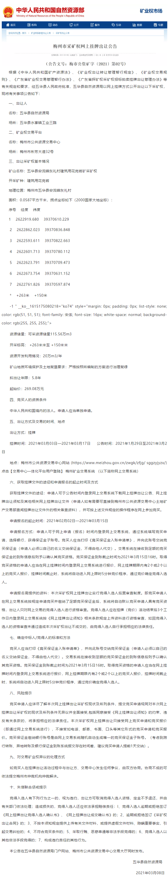 日前,五華縣自然資源局發(fā)布《梅州市采礦權(quán)網(wǎng)上掛牌公告》稱,廣東梅州市蕉嶺縣自然資源局?jǐn)M出讓蕉嶺縣文福鎮(zhèn)黃前岌——石甲尾礦區(qū)水泥用石灰?guī)r礦,擬出讓年限19年,起始價(jià)15055萬元。