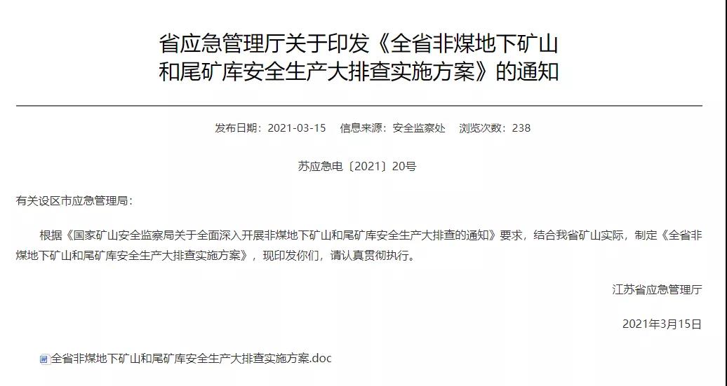近日,記者從江蘇省應(yīng)急管理廳了解到,為杜絕礦山較大以上事故,有效防范和遏制一般事故,江蘇省應(yīng)急管理廳印發(fā)通知,啟動(dòng)對(duì)全省非煤地下礦山和尾礦庫(kù)的安全生產(chǎn)大排查。