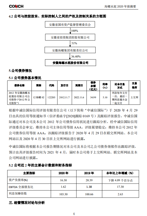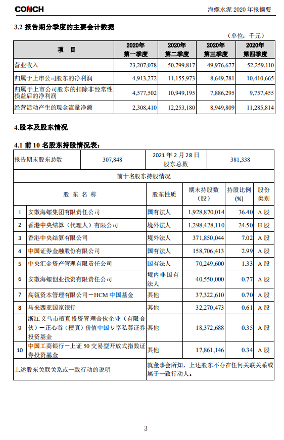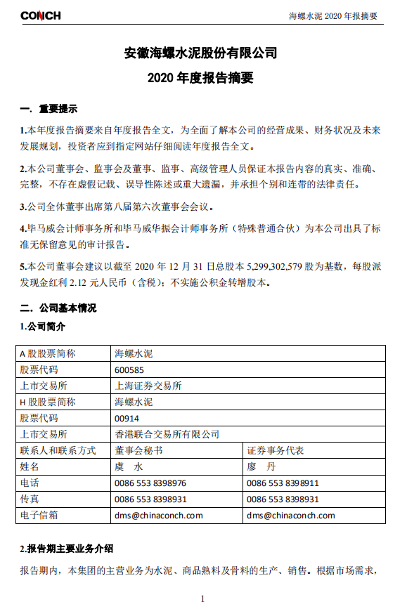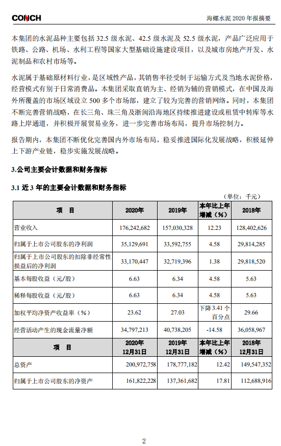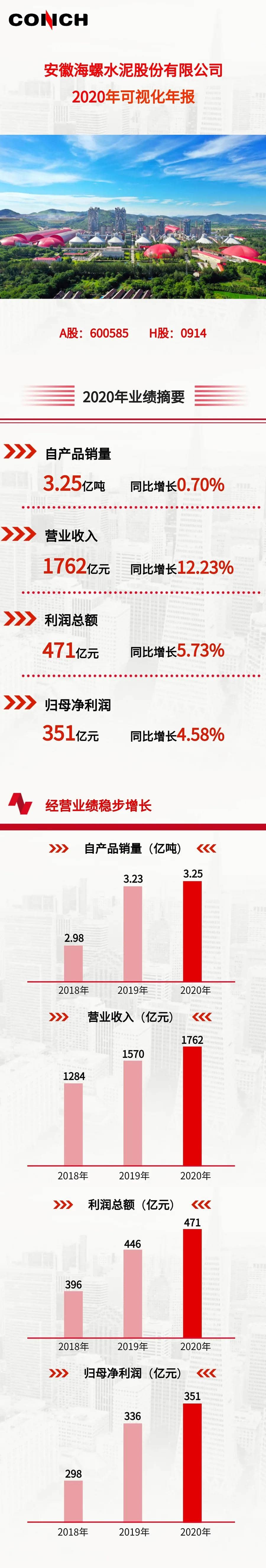 海螺水泥(600585)25日晚間發(fā)布年報(bào),2020年實(shí)現(xiàn)營業(yè)總收入1762.43億元,同比增長12.23%;歸屬母公司股東凈利潤351.3億元,同比增長4.58%;基本每股收益為6.63元。