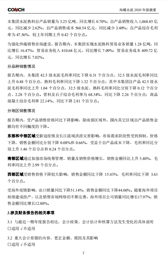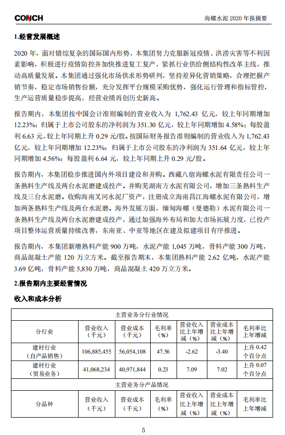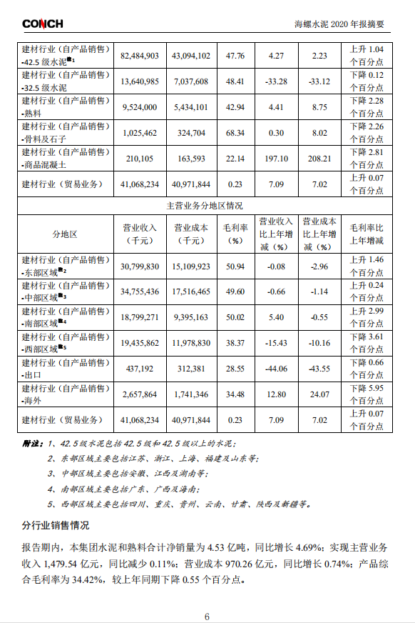 報(bào)告期內(nèi),本集團(tuán)水泥和熟料合計(jì)凈銷量為4.53億噸,同比增長4.69%;實(shí)現(xiàn)主營業(yè)務(wù)收入1,479.54億元,同比減少0.11%;營業(yè)成本970.26億元,同比增長0.74%;產(chǎn)品綜合毛利率為34.42%,較上年同期下降0.55個(gè)百分點(diǎn)。