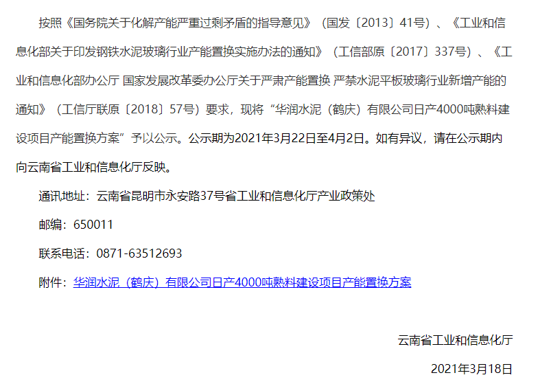 日前云南工信廳發(fā)布了一則水泥熟料生產(chǎn)線產(chǎn)能置換公示稱,華潤(rùn)水泥鶴慶公司通過退出兩條2500t/d生產(chǎn)線,在云南省大理州鶴慶縣內(nèi)新建一條4000t/d熟料生產(chǎn)線,并計(jì)劃于2024年點(diǎn)火投產(chǎn),兩條2500t/d生產(chǎn)線將于新建項(xiàng)目建成投產(chǎn)1年內(nèi)拆除退出。