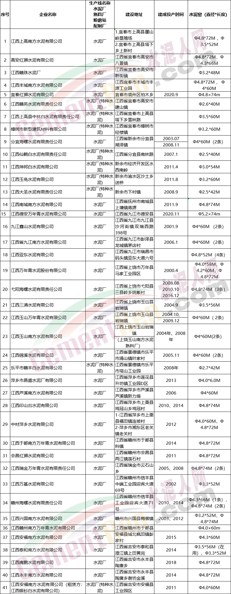 日前江西省工信廳發(fā)布截止到2020年末的水泥熟料產(chǎn)能清單,共41家全能水泥企業(yè),包括九家特種水泥生產(chǎn)企業(yè)和南方水泥、紅獅水泥、萬年青水泥、亞東水泥、海螺水泥、中材水泥等水泥集團(tuán)企業(yè)下屬全能水泥廠。其中,宜春紅獅水泥和江西德安萬年青水泥有限公司熟料生產(chǎn)線項(xiàng)目是在2020年內(nèi)建成的。 江西省水泥熟料生產(chǎn)線情況表